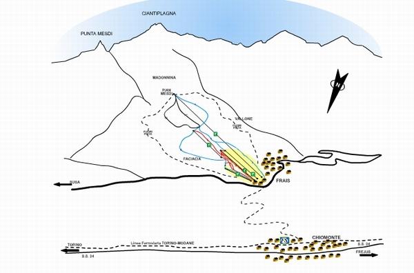 A friendly little family skiïng area above Chiomonte. Verry sunny with mostly good snow conditions. Frais can be reached from Susa by car or with a two seat chair lift running from Chiomonte. Situated in a sheltered valley where various runs converge and are particularly suitable for beginners, families, school groups and ski clubs.